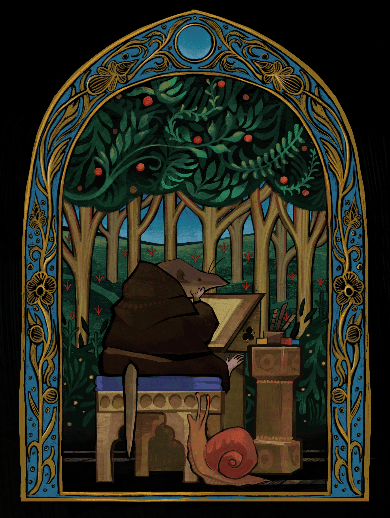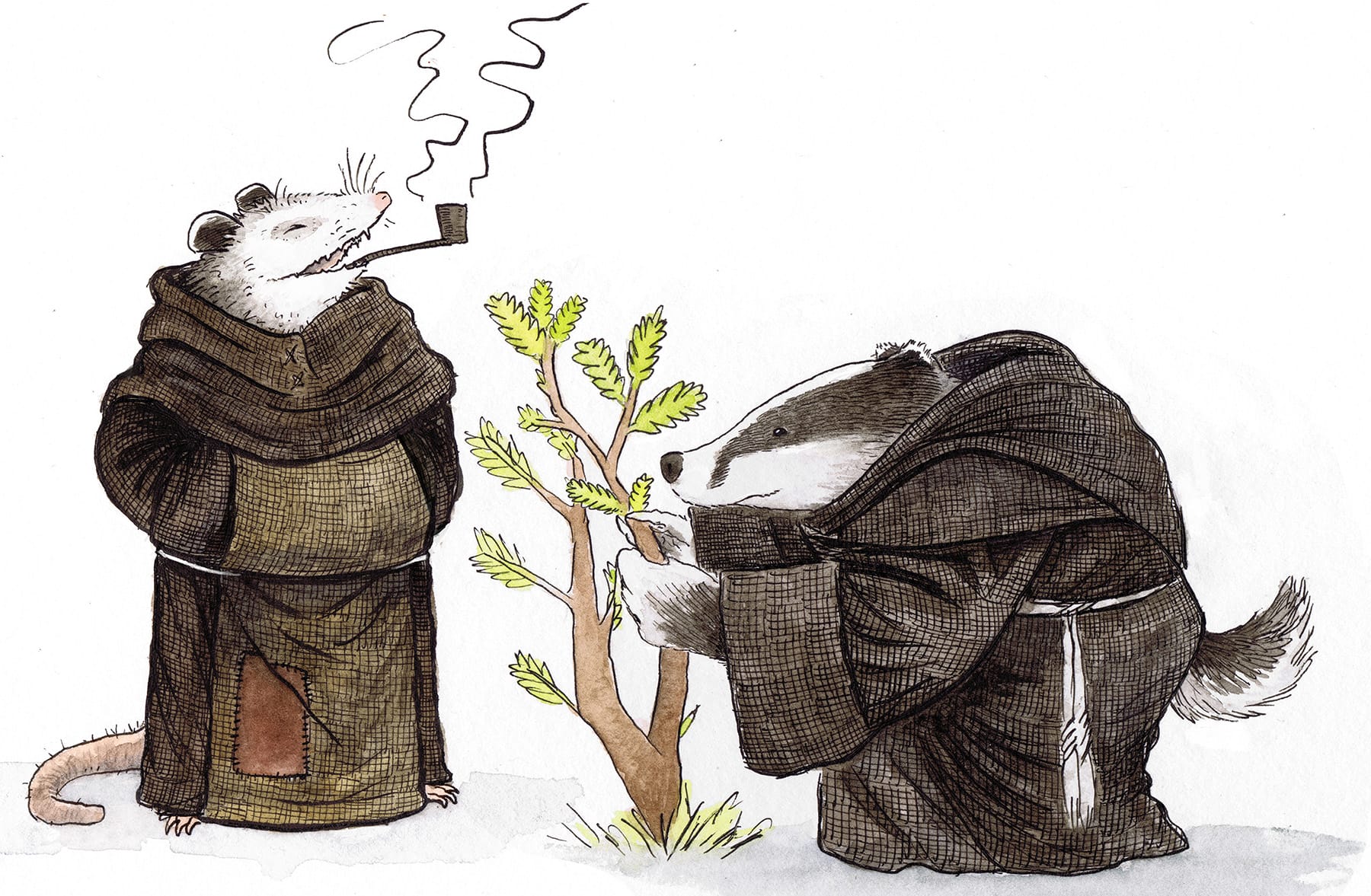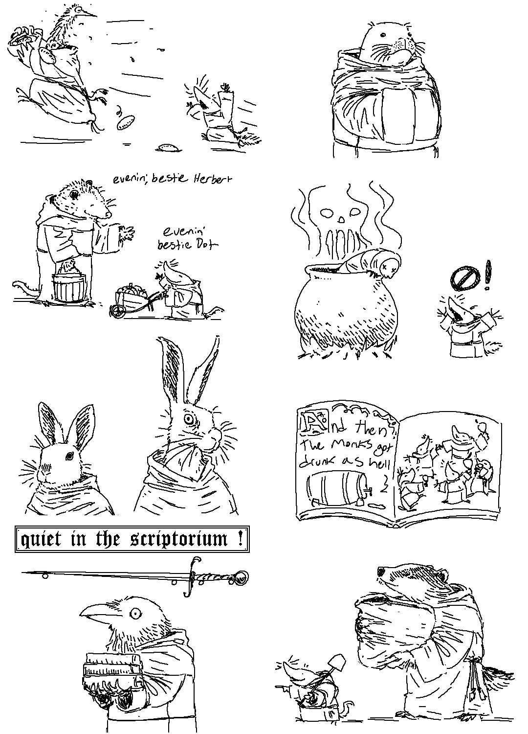 I'm not sure why critter monks were the thing that snowballed from a handful of doodles into a subject that's dominated the majority of my artistic output for over two years now. I'm not a religious person but I've always found something charming and appealing about the idea of a simple monastic life, or at least its secular aspects. I don't imagine my critter monks as literal catholics or members of any real world religion for that matter, but in my mind this monastery is more of a gentle frat house or commune for silly little guys that don't fit into regular society and can just spend their days gardening, making wine and cordials, illuminating books, and so on. The franciscan style robes and other mendicant affectations are just some cosmic coincidence, ultimately because I like drawing them. My monks probably have some kind of spiritual beliefs but of something much gentler than medieval catholicism.