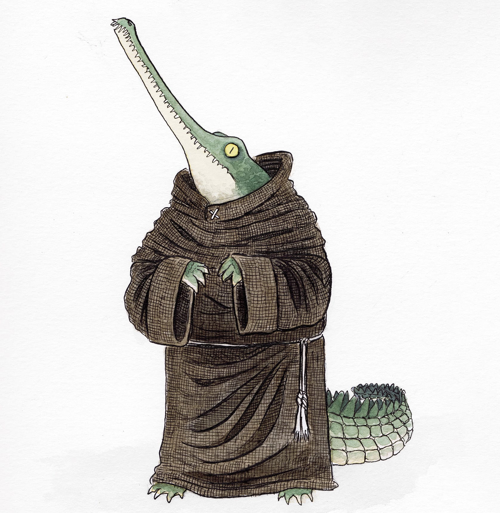 By 2023 I started drawing more shrew and shrew-adjacent critters, often also wearing little robes and hoisting tiny glasses of wine, Eduard von Grützner style. In 2024 and 2025 the cast expanded to incorporate other groups of animals that I thought would look cute in little robes, with Brother Gregor the gharial and Brother Ignatz the bittern being the first two to receive actual names. They weren't originally intended to occupy the same world as the semi-monastic shrews I'd been drawing but one thing led to another and everything got kind of smushed together into a single not particularly coherent setting that my partner dubbed the Monastic Menagerie.